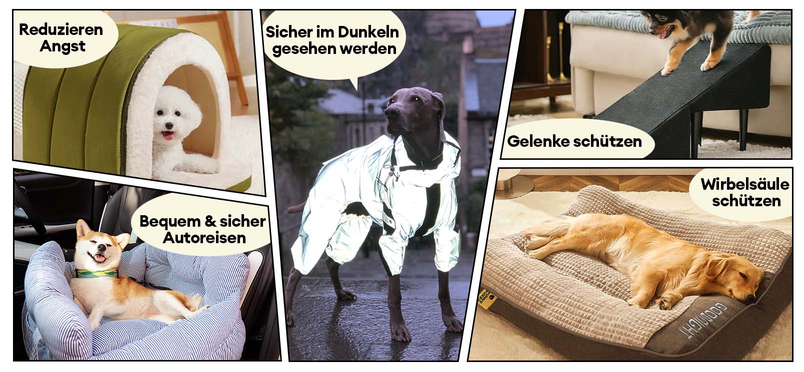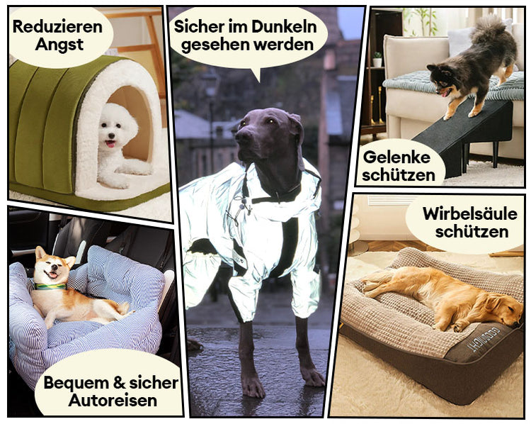 Von gelenkschonenden Treppen bis zu orthopädischen Betten – jedes Produkt sorgt für Komfort und Wohlbefinden. Kauspielzeuge stärken, Krallenschneider schützen, und Jacken halten Wind und Kälte fern.