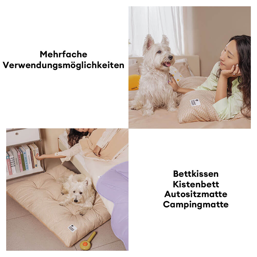 Wendbares Design: Mit zwei einzigartigen Texturen auf jeder Seite können Sie zwischen weichem Plush und glattem Stoff wechseln, um ein personalisiertes Komforterlebnis zu schaffen, das sich der Stimmung und der Saison Ihres Hundes anpasst.